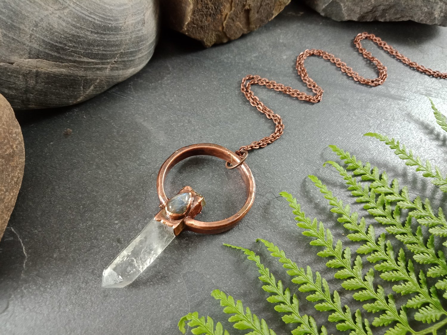Clear Quartz & Labradorite Pendant – Antique Copper (65mm)