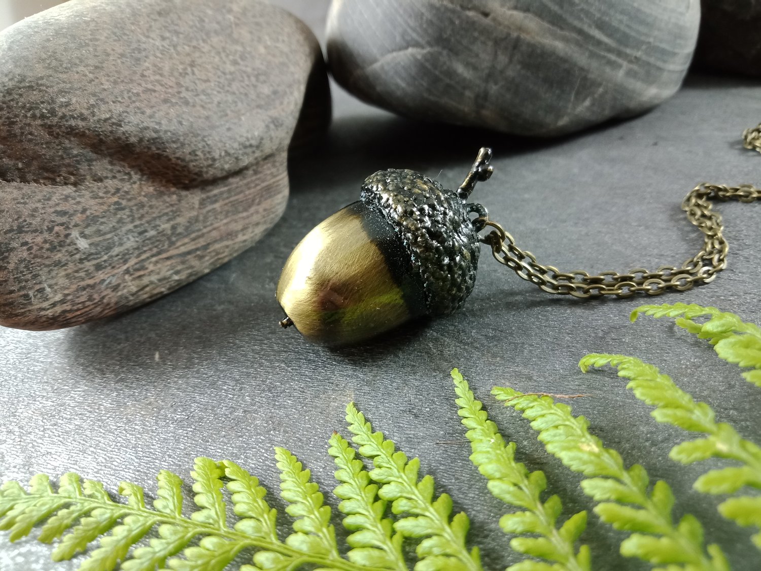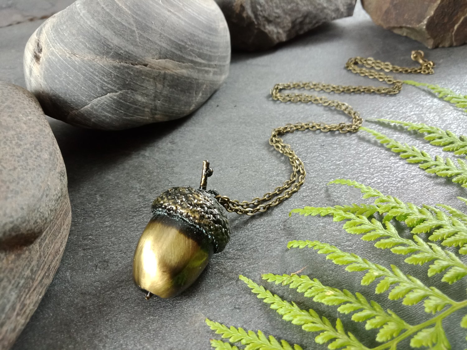 This handcrafted Acorn Pendant features a genuine natural acorn, preserved through electroforming to capture its intricate texture and organic charm in lasting detail.