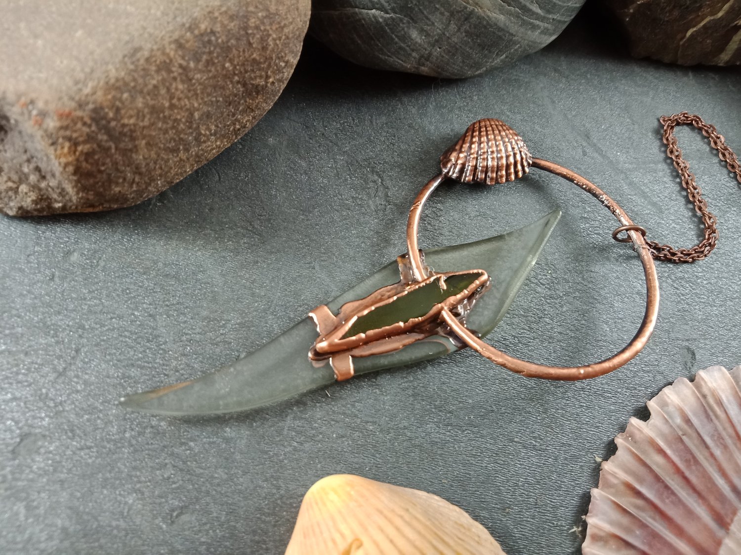 Sea Glass & Shell Pendant – Antique Copper (93mm)