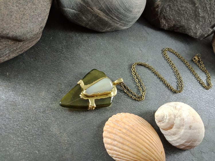 This handcrafted pendant features two stunning pieces of natural sea glass paired with a tiny genuine shell, preserved forever through the art of electroforming. The textures and coastal charm of these natural elements are captured in lasting detail, celebrating their oceanic origins.