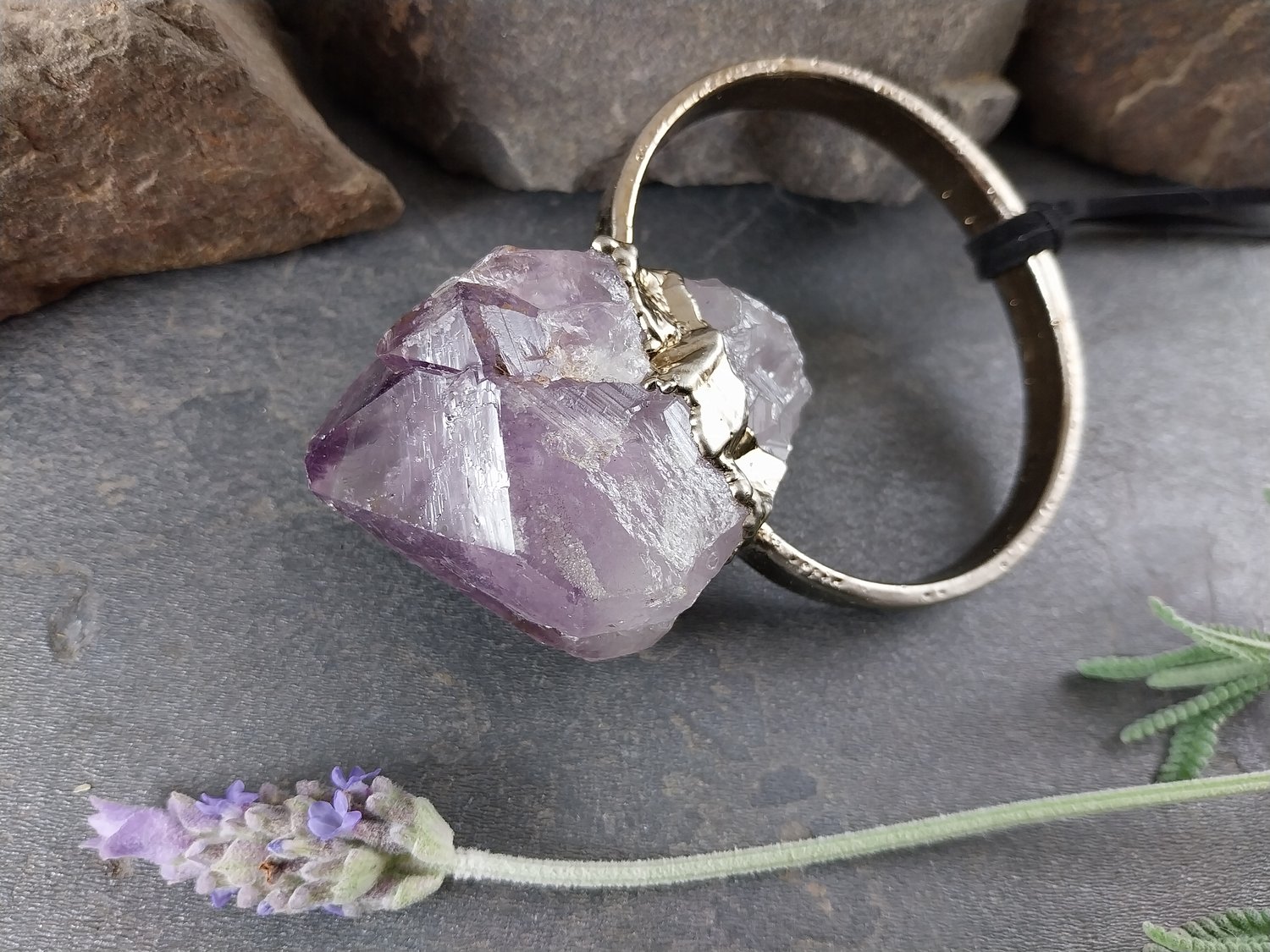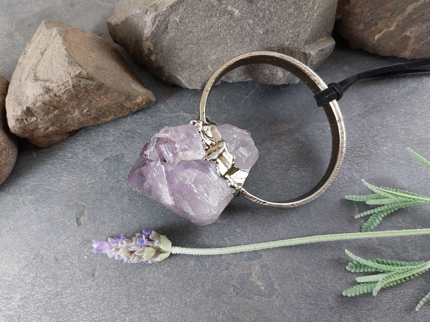 This handcrafted Amethyst Point Pendant features a striking natural amethyst crystal, preserved through electroforming to showcase its raw beauty and rich purple tones.